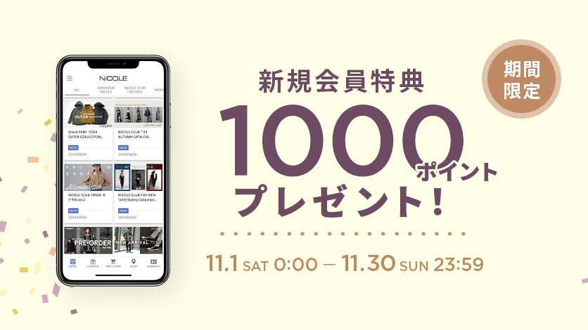 ニコル公式新規会員登録特典500ポイントが、上記期間中【1,000ポイント】に!。